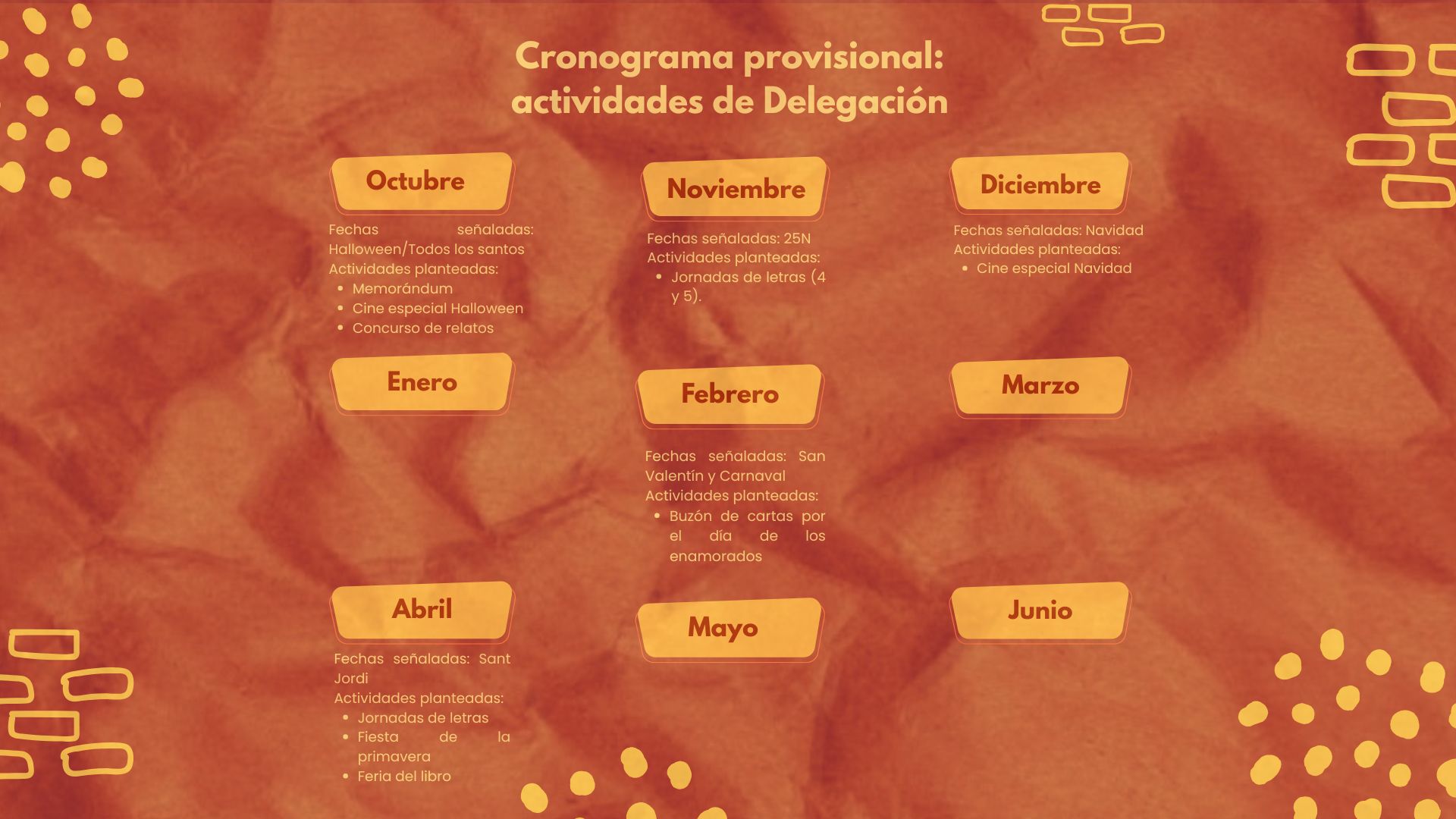 | Comisión de Jornadas de Letras y Actividades Culturales | Se encargará de organizar y gestionar la Jornada de Letras así como diferentes actividades de interés para llevar a cabo en nuestra facultad. En esta comisión se recomienda que, llegado el momento, colaboren más miembros | José García Alfaro, Rodrigo López Quispe, Paula Vázquez Claros, Julia Quirós Rodríguez, Julio Ayllón Soto | Iria Valenzuela Sánchez |