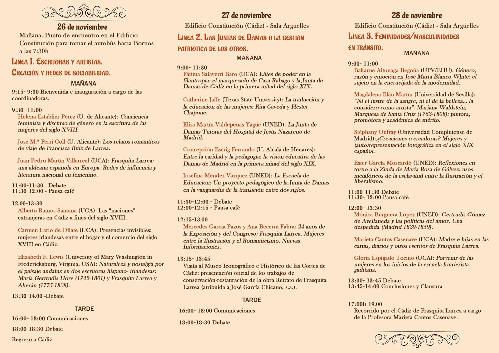El 28 de noviembre de 1775 nació en Cádiz Francisca Javiera Ruiz de Larrea Aherán, más conocida como Frasquita Larrea. Escritora, traductora, editora, viajera, miembro de la Sociedad Patriótica de Damas o Junta de Señoras de Fernando VII y, luego, de la Clase de Damas de la Sociedad Económica de Amigos del País —en la que compartió actividad con su hija Aurora Böhl Larrea—, su obra y el papel que desempeñó han sido aún poco estudiados. Con el motivo de este 250 aniversario, su figura se va a constituir en el marco sobre el que abordar una reflexión sobre distintas problemáticas relacionadas con el contexto histórico europeo en el que se desenvolvió.